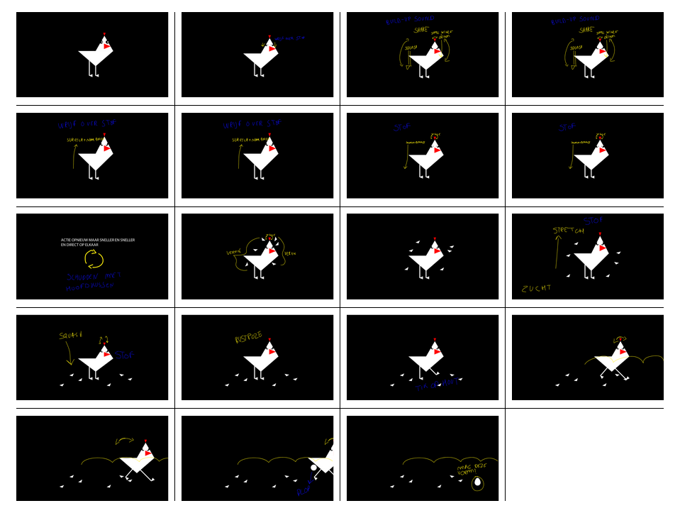 Een geometrische interpretatie van een gefrustreerde kip die probeert een ei te leggen. De animatie toont het contrast tussen de normale en gefrustreerde toestand, met gebruik van squash-and-stretchprincipes en expressieve bewegingen.