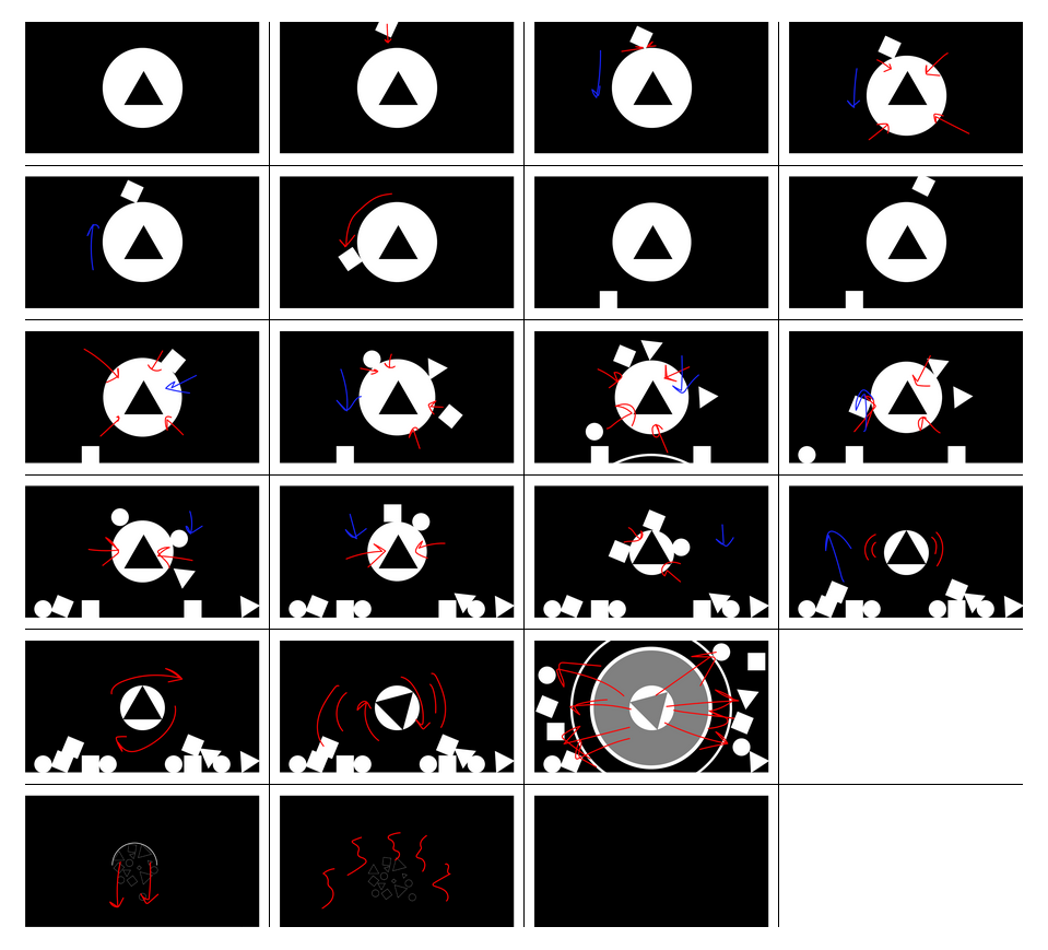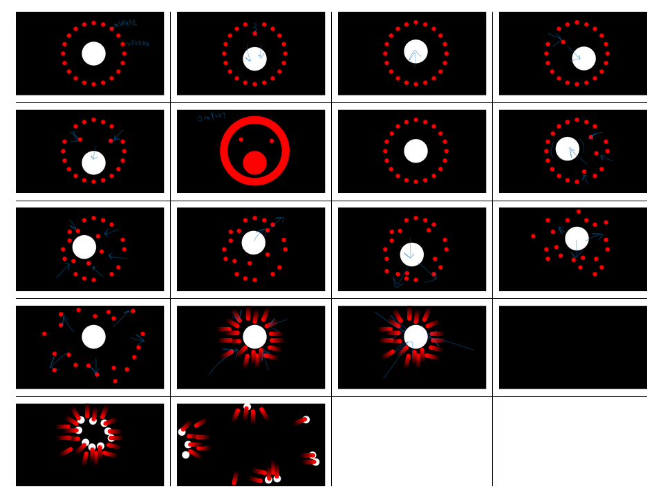 Een cirkel die overweldigd raakt door chaos en vormen. De animatie evolueert van gestructureerd naar chaotisch, prikkelend en botsend, waarbij er een ontploffing ontstaat door de overweldiging.